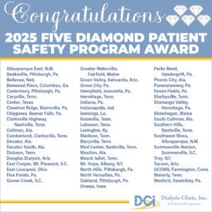 Our clinics strive to reinforce the importance of patient safety within their facilities and the 5 Diamond Patient Safety Program helps them to learn ways to assess and improve. Clinics earn the designation when successfully completing five modules and staff answering questionnaires. DCI is proud to name these 5 Diamond Patient Safety Program Award recipients.Â