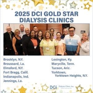 Congratulations to DCI clinics that were honored as Gold Star facilities. From September 2024 to August 2025, 10 DCI clinics met or exceeded the following Star Award criteria: catheter > 90 days, patients active on the UNOS transplant waitlist, medicine reconciliation and encouraging patients to receive the flu vaccine. Â