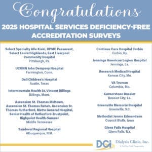 DCI recognized Area Operations Managers and Nurse Managers from hospital programs with deficiency-free accreditation surveys in 2025. These programs comply with the Conditions of Participation, regulatory requirements for participating in Medicare and receiving Medicare and Medicaid payments. The dialysis programs met all Conditions of Participation requirements as part of their hospital-wide programs.Â