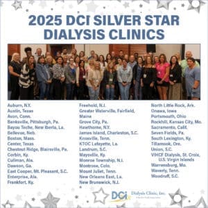 Congratulations to 42 DCI clinics named 2025 Silver Star clinics for meeting three of the four criteria: catheter > 90 days, patients active on the UNOS transplant waitlist, medicine reconciliation and encouraging patients to receive the flu vaccine.Â